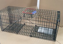 Designed to aid rescue organisations in the capture of wild or feral cats for neutering purposes. The food is placed on the treadle plate and activated on slight pressure releasing the swinging door. End Opening sliding door for transferring into other baskets. Silent operation does not frighten animal in any way due to plastic coated metal. Plastic coated in green to blend in with surrounding. Light weight. Size 76.2cm x 30.5cm x 30.5cm |
